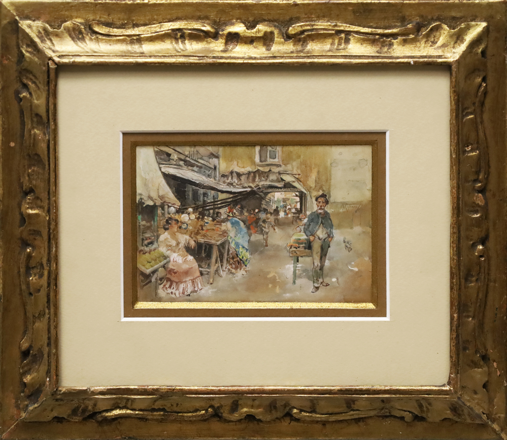 Firma a destra Migliaro fu uno dei grandi cantori di Napoli, vista nei suoi vicoli, nelle sue strade, nelle sue osterie, e l’opera in esame è un tipico esempio della sua produzione a cavallo tra la fine del XIX e gli inizi del XX secolo. Acquarello di raffinata qualità.