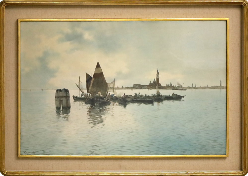 Opera autografa di Alberto Prodocimi, firma in basso a sinistra, artista nato a Venezia nel 1852 formatosi all’Accademia di Belle Arti e presso la bottega paterna. Fu uno dei pù grandi acquarellisti del XIX secolo, Venezia fu la sua musa ispiratrice. La sua tecnica è inconfondibile, riconoscibile. Fu anche un grande illustratore di manoscritti. Grande insegnante, noto per essere il maestro di reali in tutta Europa, ebbe anche un grande mercato internazionale.