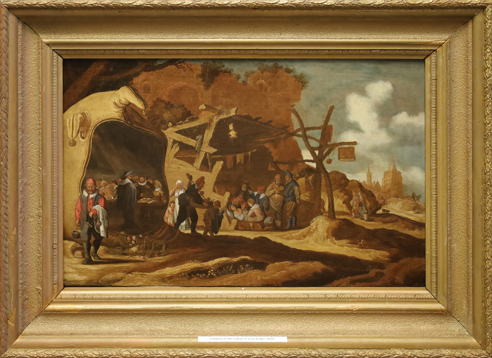 Interessantissima opera che racconta, in maniera allegorica, si vede Flora ormai defunta, la bolla speculativa sui prezzi dei bulbi di tulipani, scoppiata nell’economia olandese nel 1637. Il dipinto deriva da un disegno di Pieter Nolpe, e da un’incisione a sua volta di Cornelis Danckerts, “Floraes Gecks-kap”. Possiamo vedere nel grande Kap, berretto, lo svolgersi dell’asta, mentre all’esterno già è manifesto il panico generato dal tracollo dei prezzi dei bulbi. L’immagine è chiaramente ispirata alle opere di Hendrik Gerritsz e Jan Bruegel il giovane, sia per il soggetto storico affrontato che per la grande luminosità che invade l’opera.